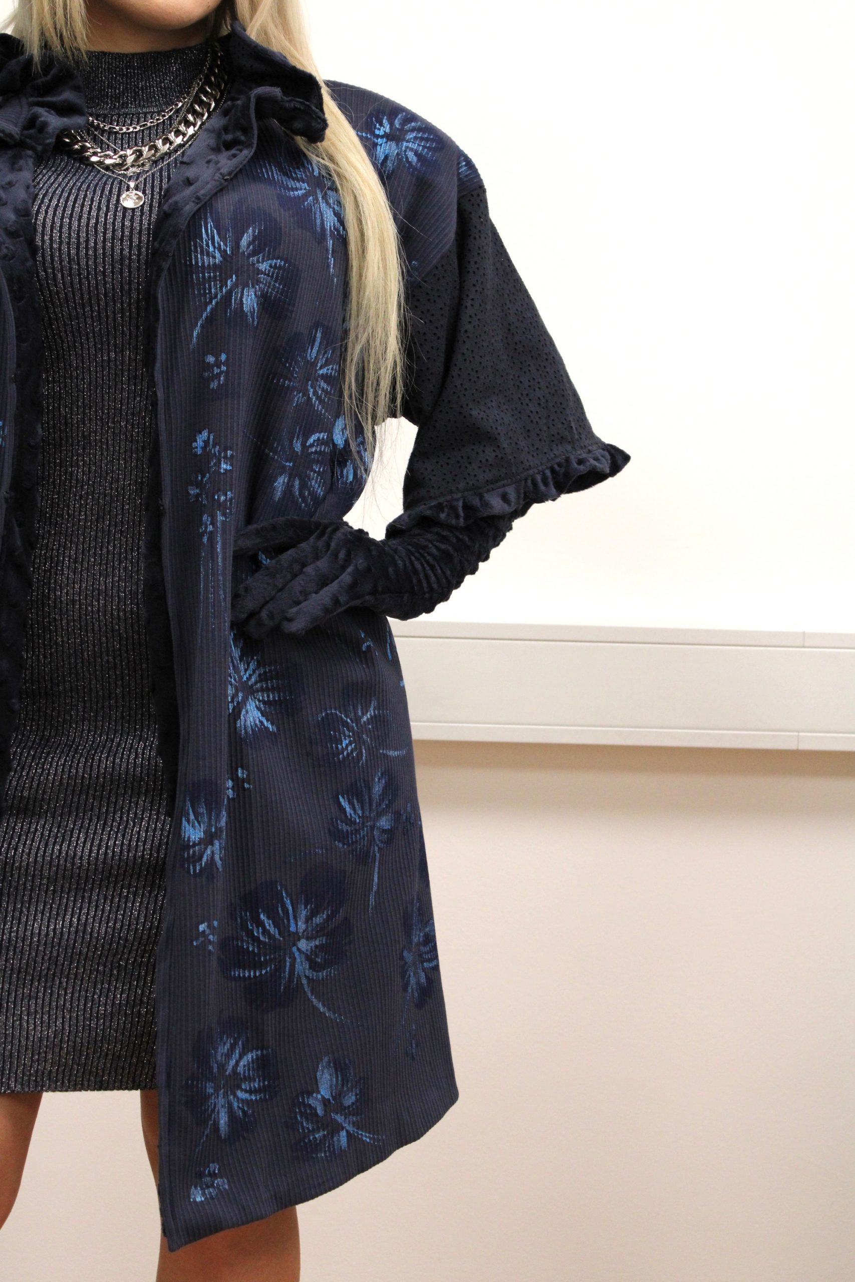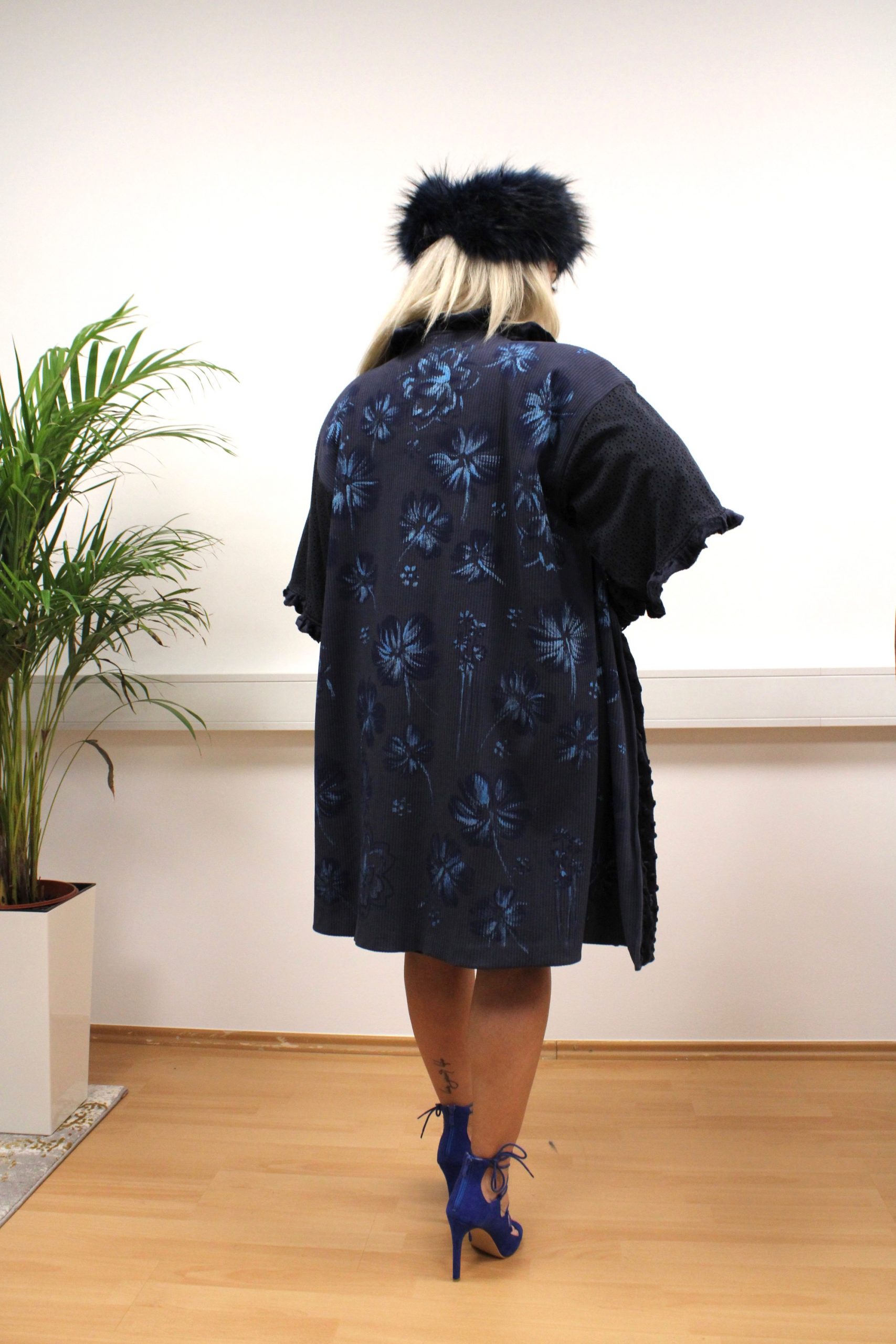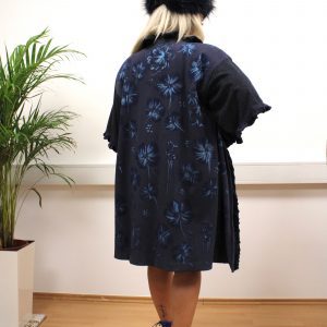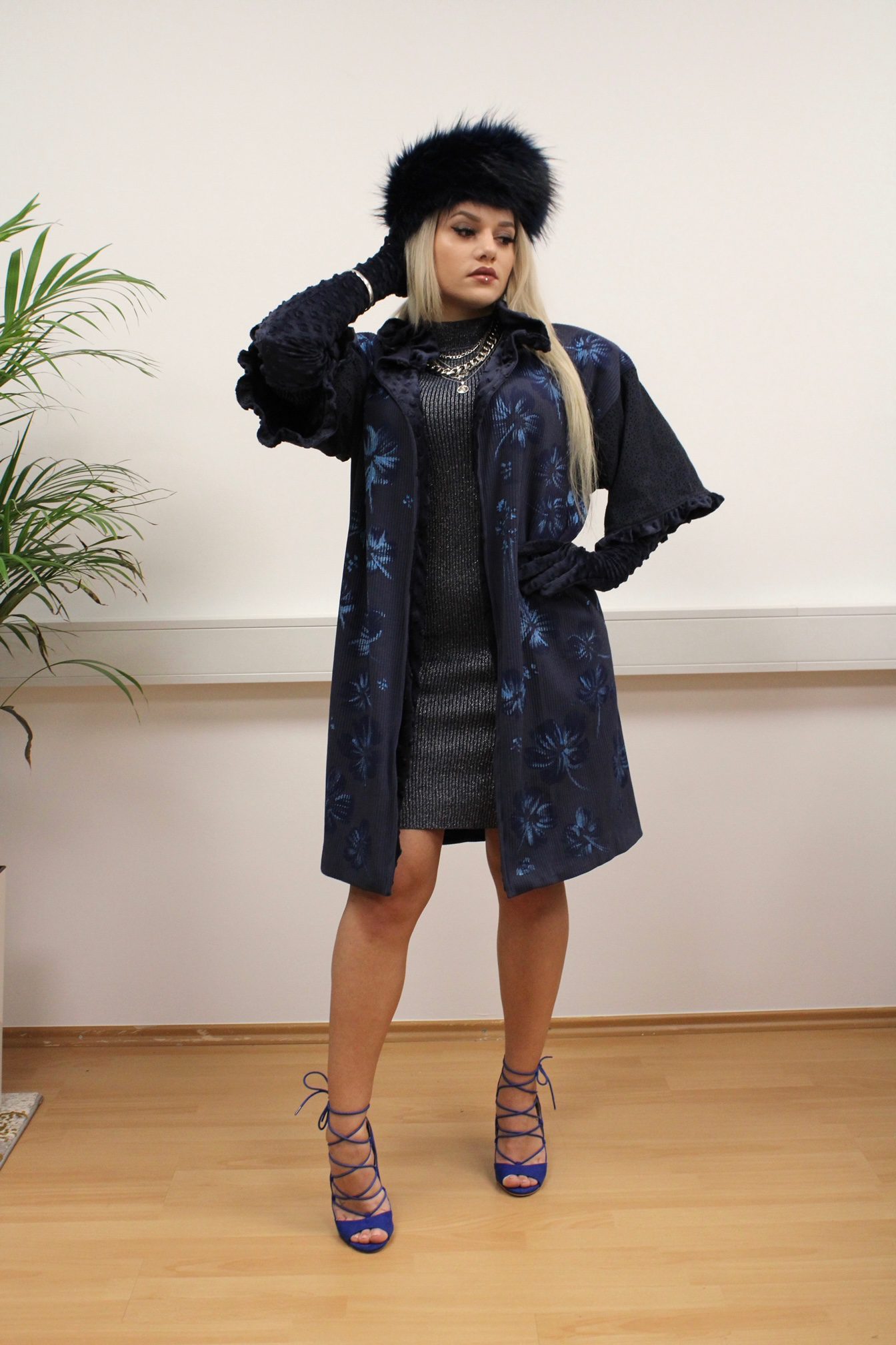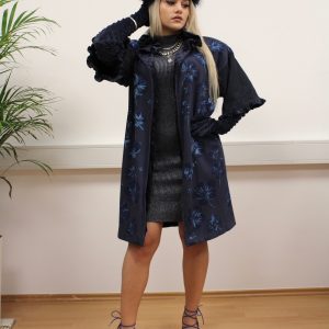 Bombažni plašč v temno modri barvi z ročno poslikavo. Notranjost izjemno mehka, prijetna tkanina. V kompletu z dolgimi rokavicami. Poudarjena ramena.