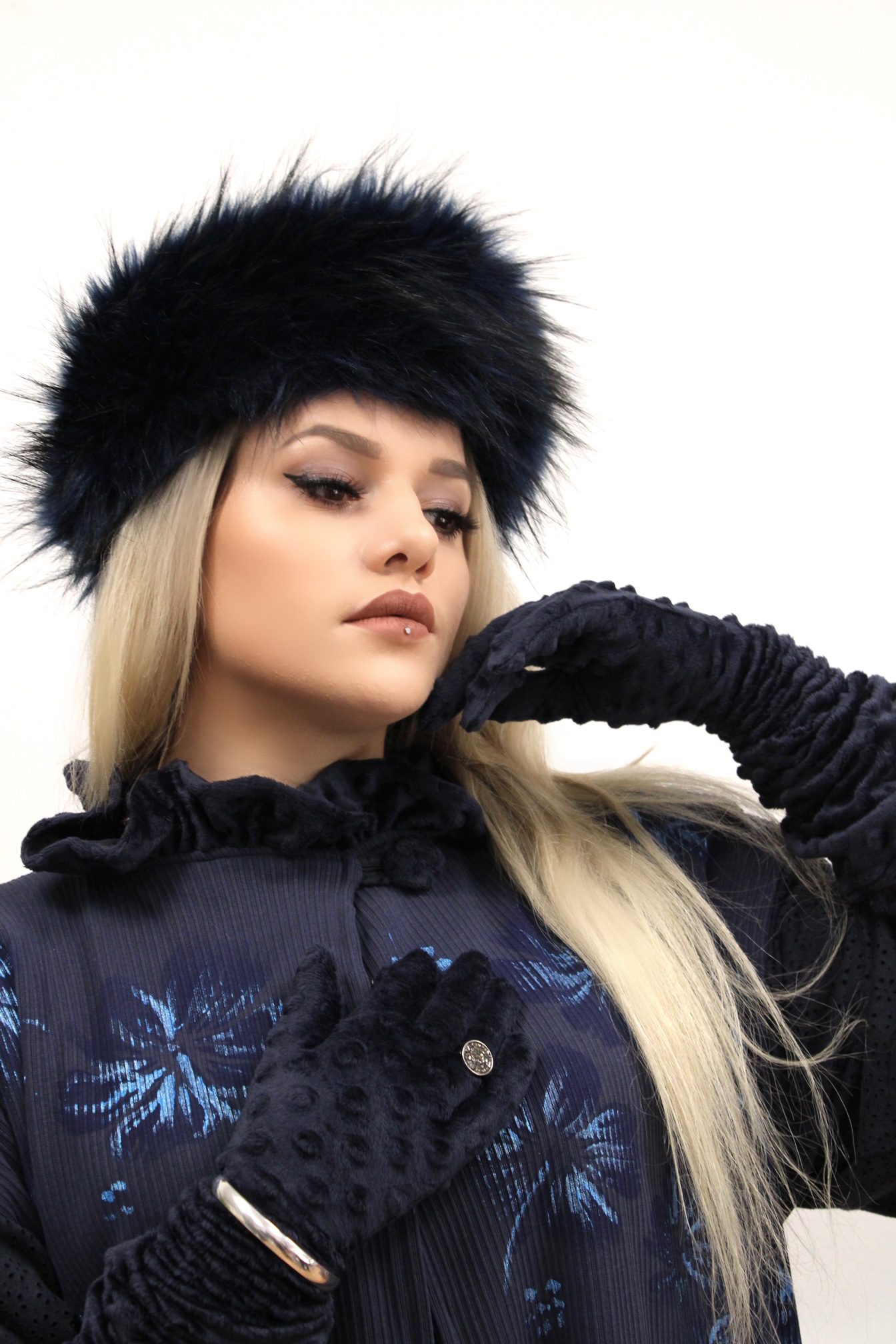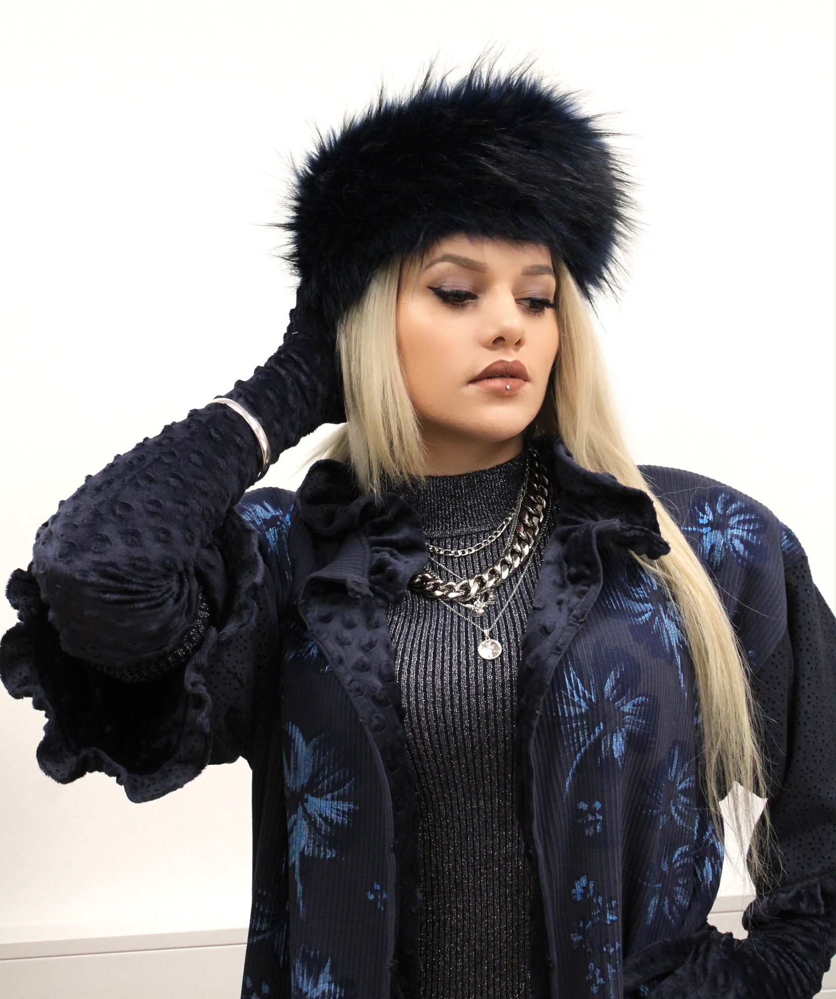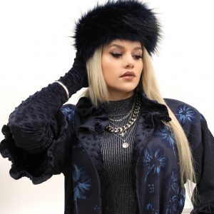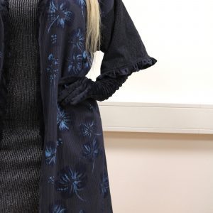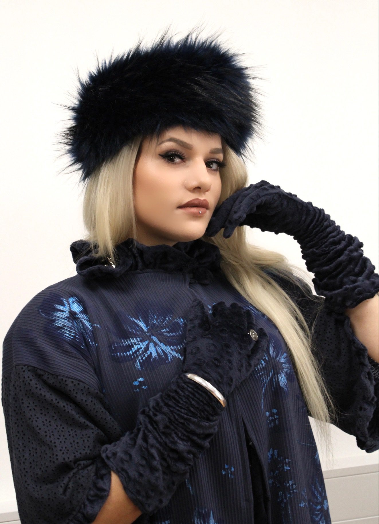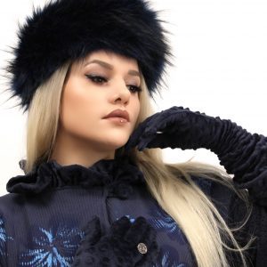 Bombažni plašč v temno modri barvi z ročno poslikavo. Notranjost izjemno mehka, prijetna tkanina. V kompletu z dolgimi rokavicami. Poudarjena ramena.