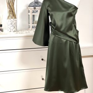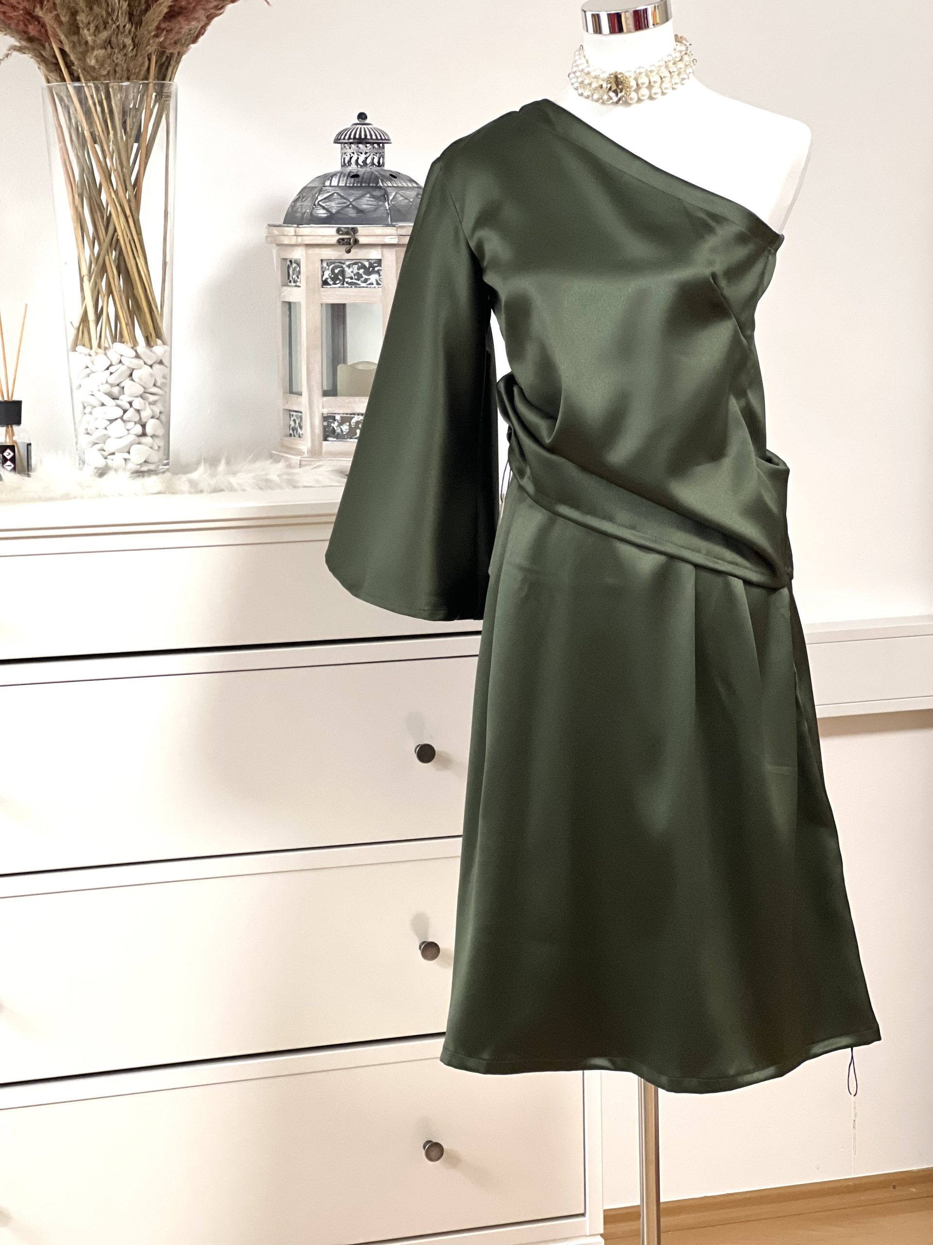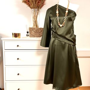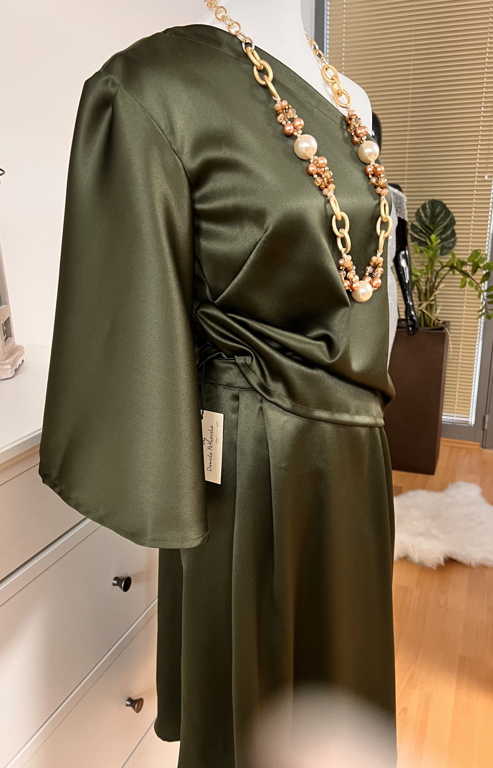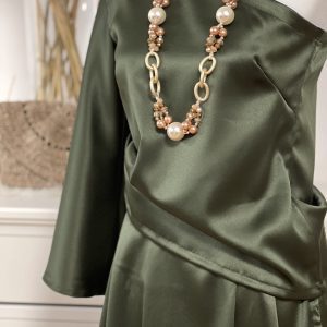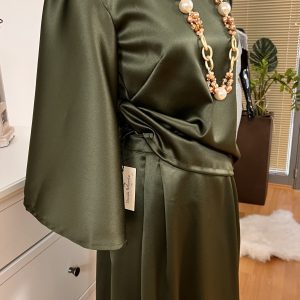 Čudovito krilo iz satena v kompletu z srajco z enim rokavom v olivno zeleni barvi. Ročno delo.