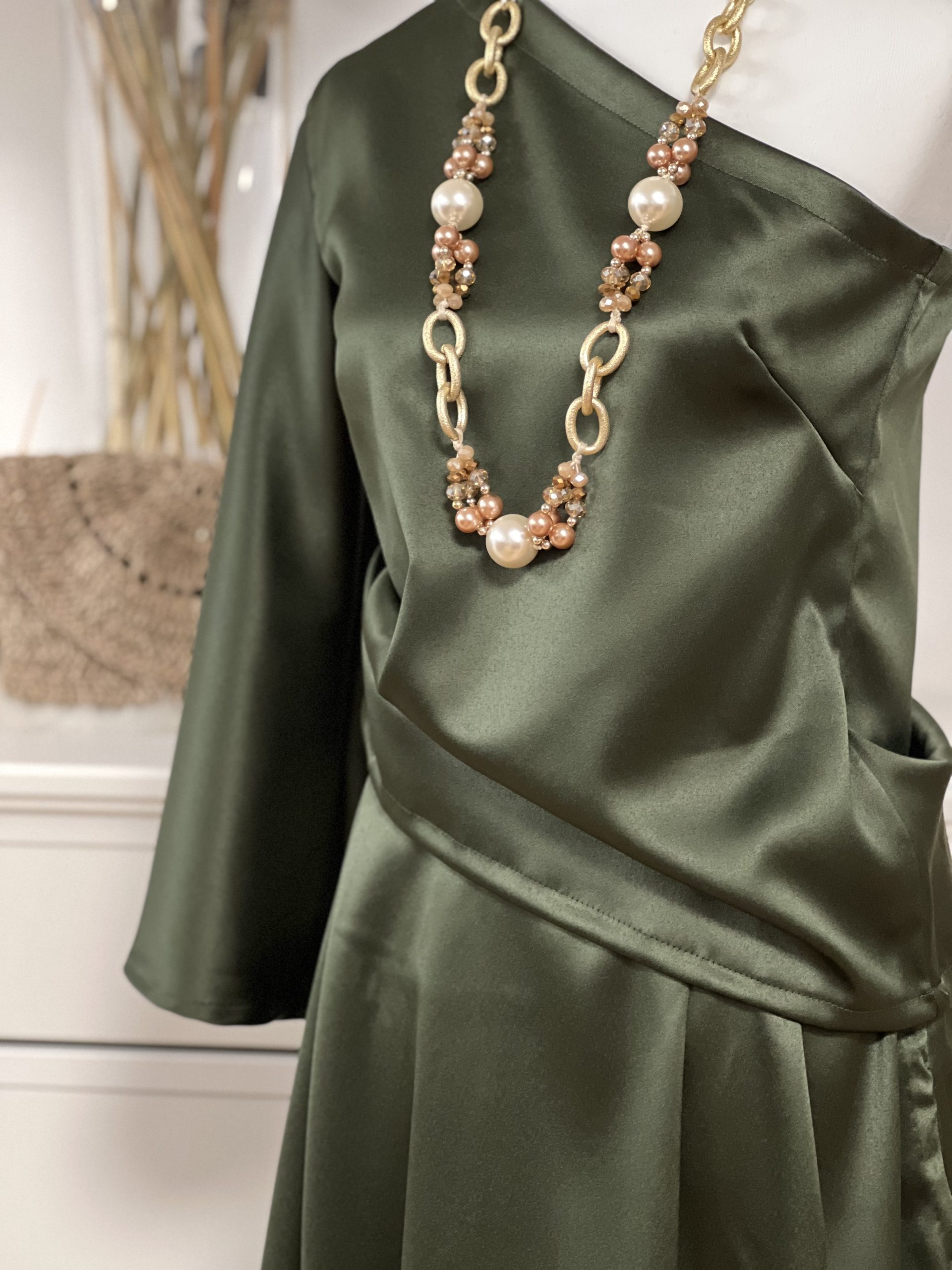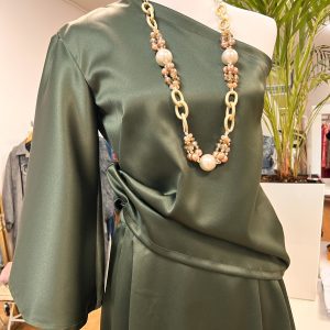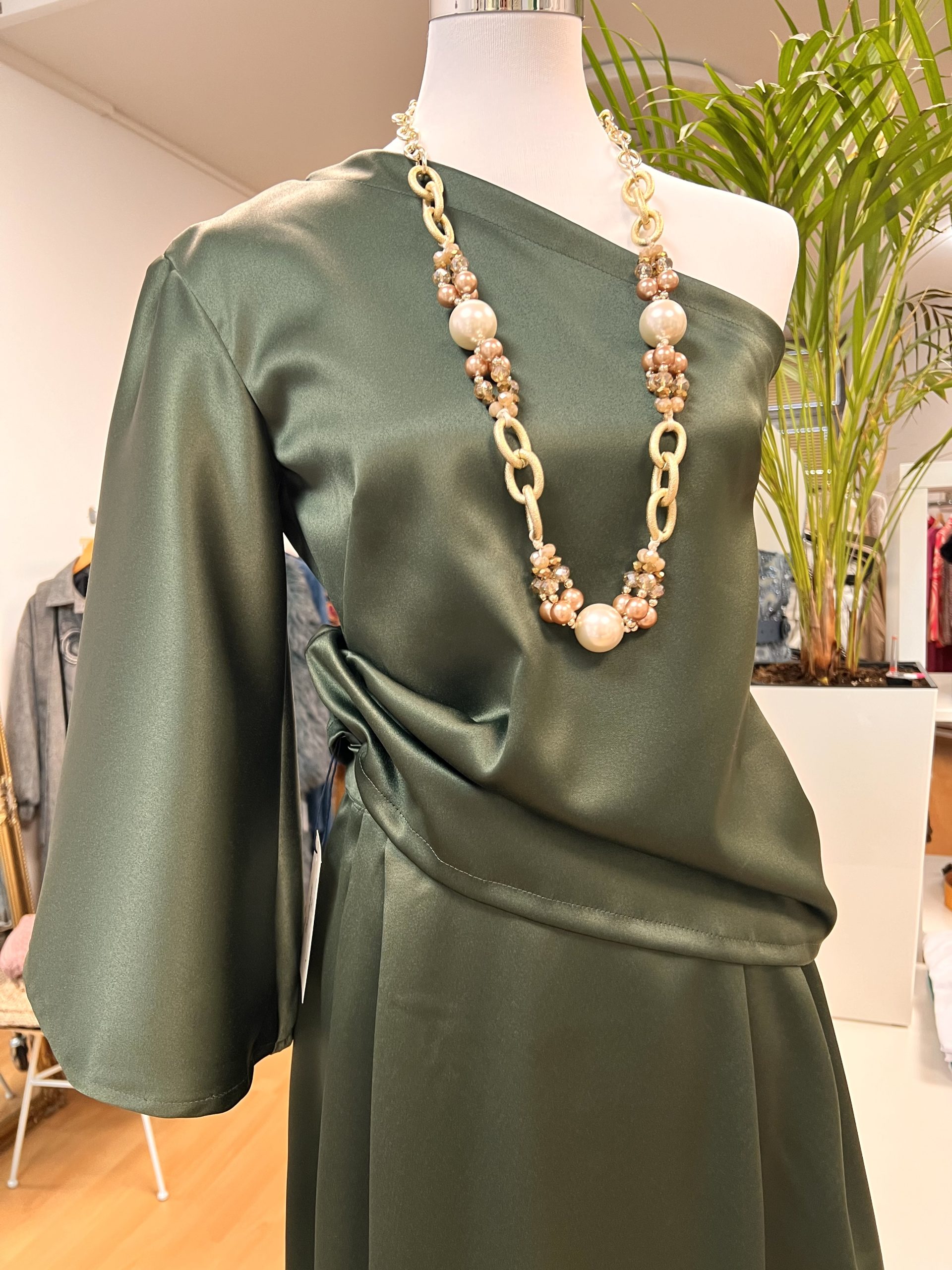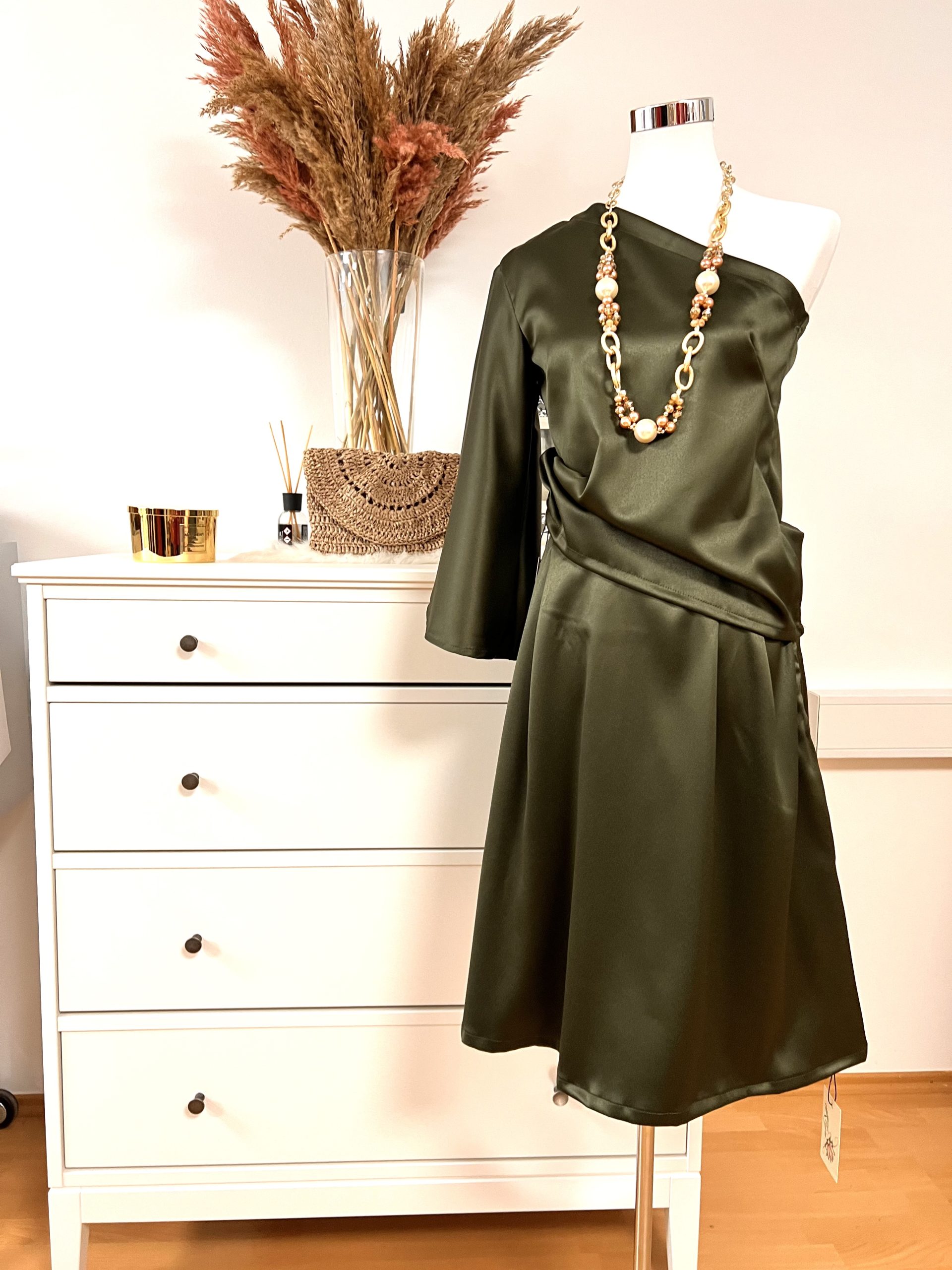 Čudovito krilo iz satena v kompletu z srajco z enim rokavom v olivno zeleni barvi. Ročno delo.