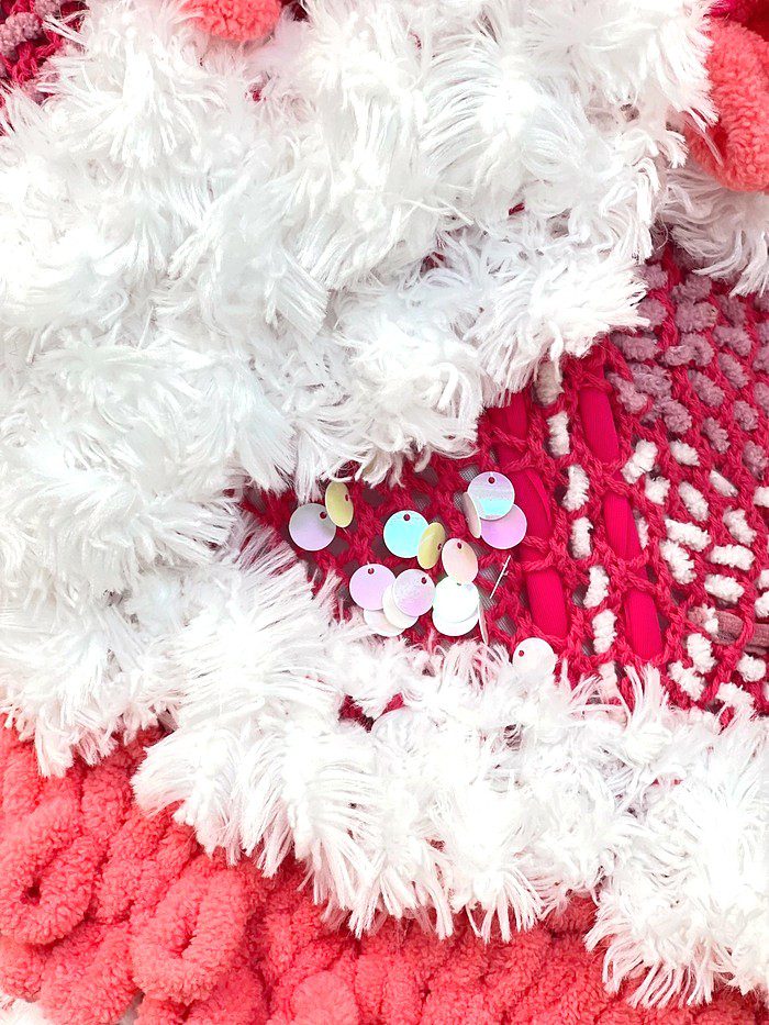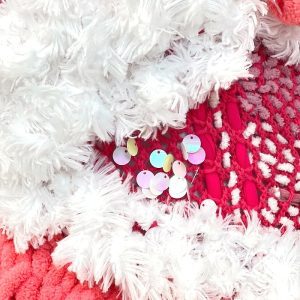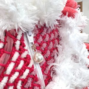 Furry charming handmade jacket made of soft cozy yarn on a cotton base. She will cuddle you, create a flirtatious attitude and leave a trail of admiring glances in her wake. A color palette of snow white and coral red was used. We made various forms with loops, from which we created an interesting 3D shape. The hand knitting technique is also used, and for the finishing touch, the jacket is decorated with glittering scales and a pearl on the zipper. The lining is viscous and also very soft.