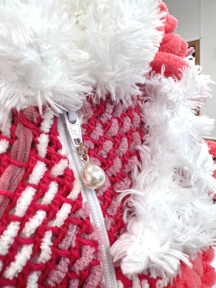 Kosmata očarljiva ročno izdelana jakna iz mehke prijetne preje na bombažni podlagi. Pobožala vas bo, ustvarila spogledljivo držo in za seboj pustila sled občudujočih pogledov. Uporabljena je bila barvna paleta v snežno belem in koralno rdečem odtenku. Z zankami smo izdelali različne forme, iz katerih smo ustvarili zanimivo 3D obliko. Uporabljena je tudi tehnika ročnega pletenja, za piko na i pa je jakna okrašena z bleščečimi luskami in perlo na zadrgi. Podloga je viskozna in tudi zelo mehka.