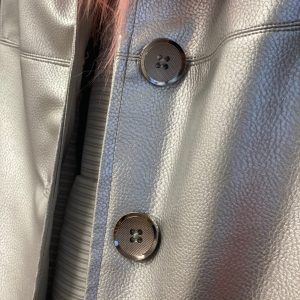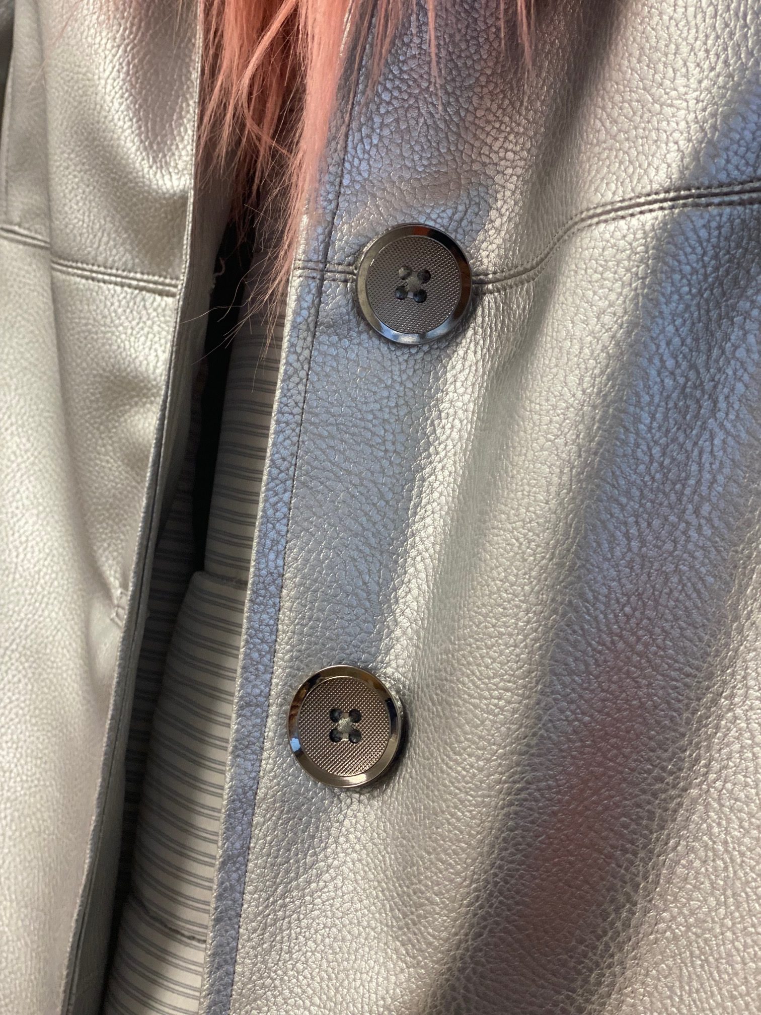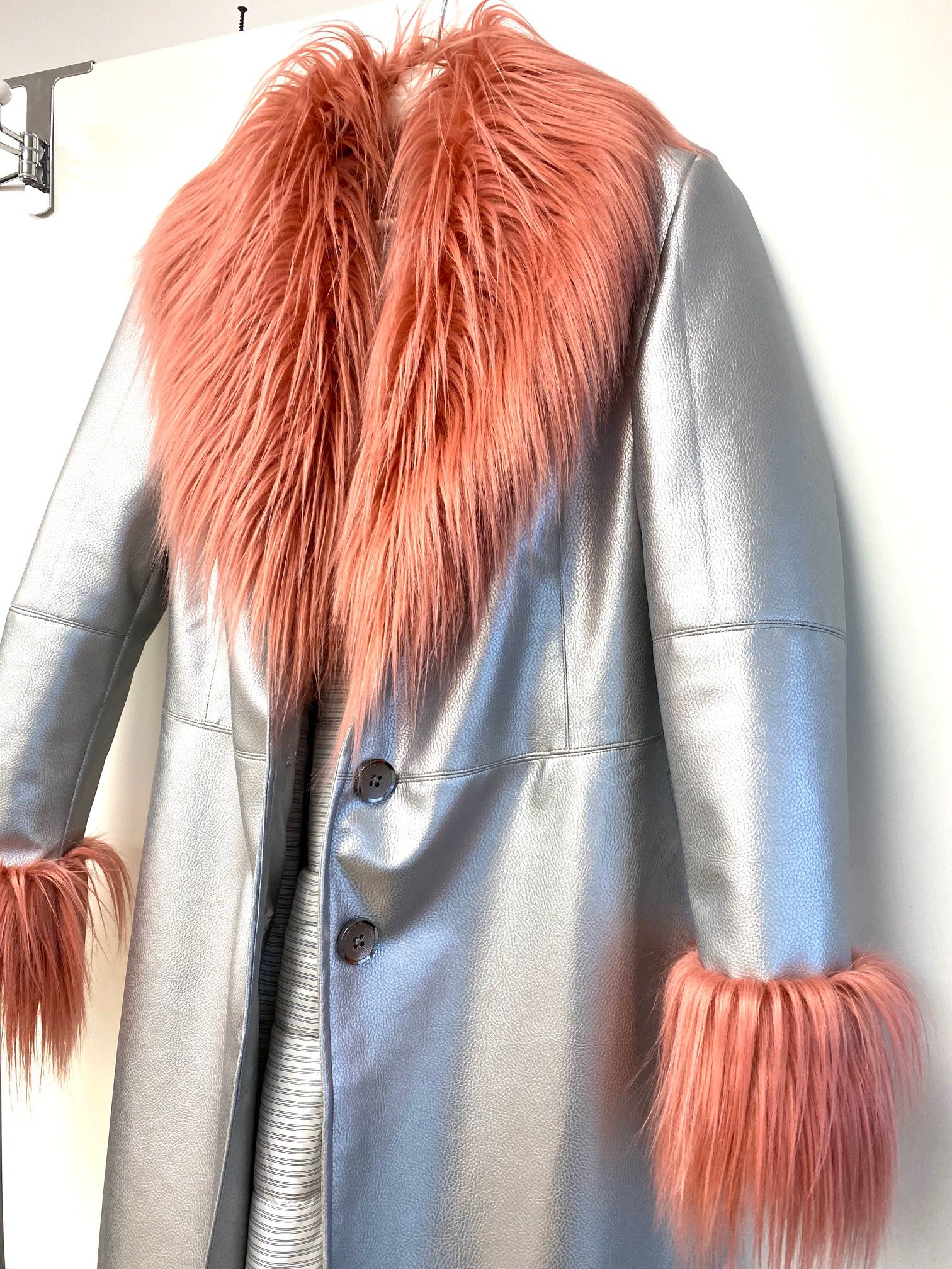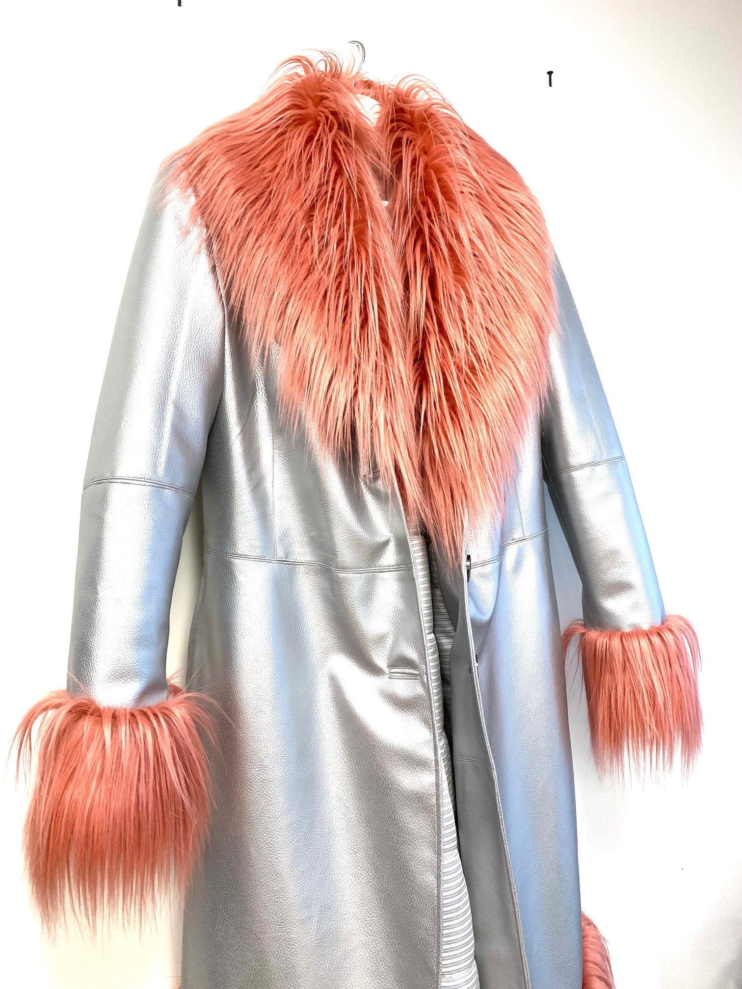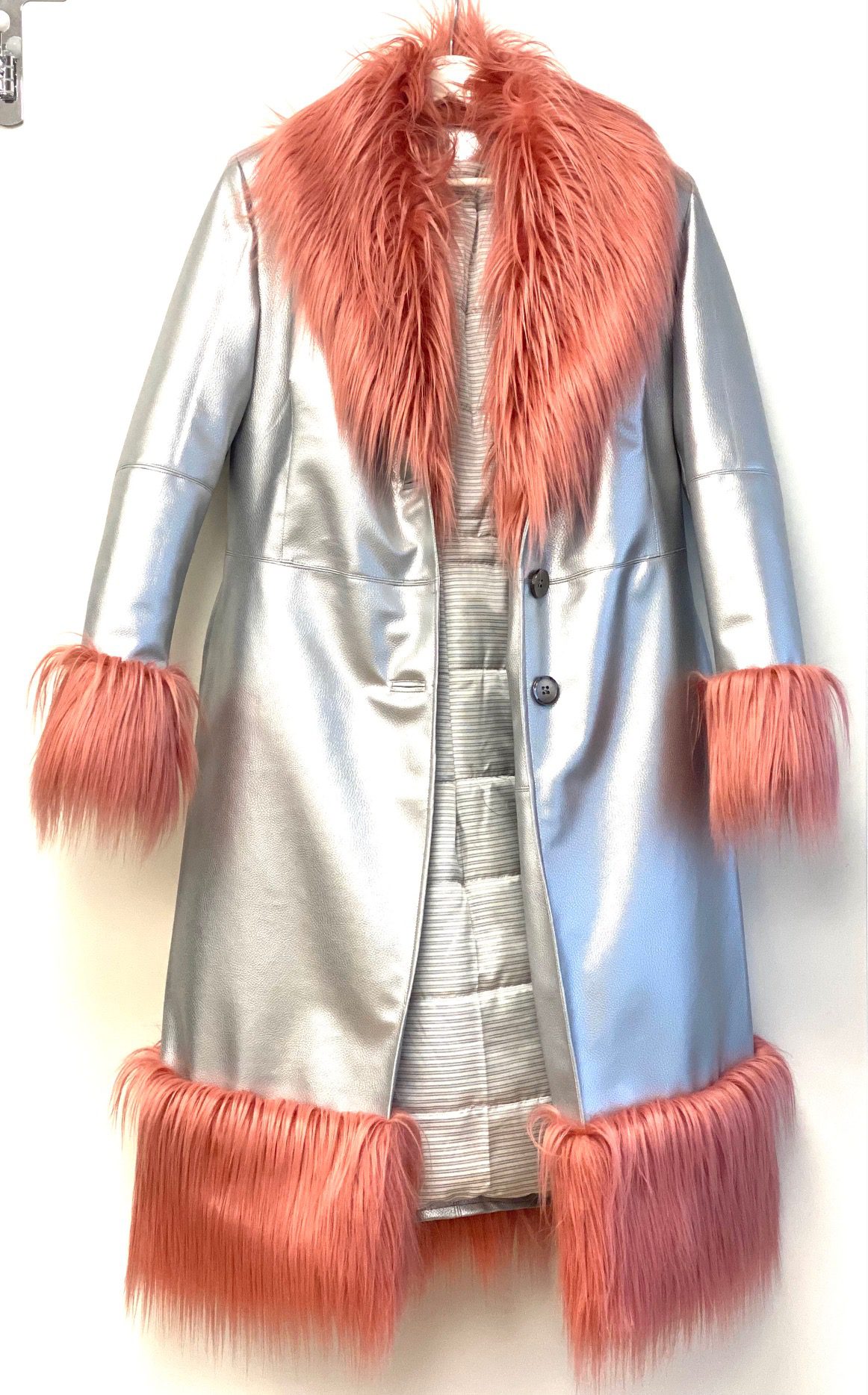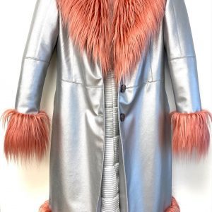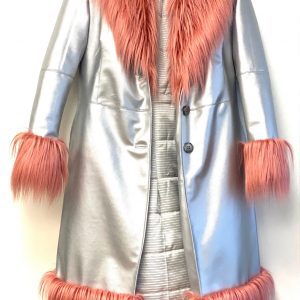 Luksuzen plašč iz tekstilnega usnja v srebrni barvi, notranjost iz viskoze. Skrbno izbrani materiali in premišljen dizajn. Kot dekoracija na ovratniku in na rokavih je dodano čudovito dolgodlako krzno v privlačni roza barvi. Plašč je podložen, topel in primeren za zimske dni.