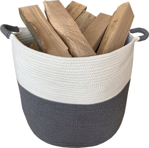 Večnamenska sivo/bela košara iz naravnih materialov, vsestranska, primerna tako za shranjevanje drv kot časopisov, otroških igrač, pripomoček v avtu pri nakupih, shranjevanje perila ali preprosto lep oblikovalski dodatek za notranji prostor.