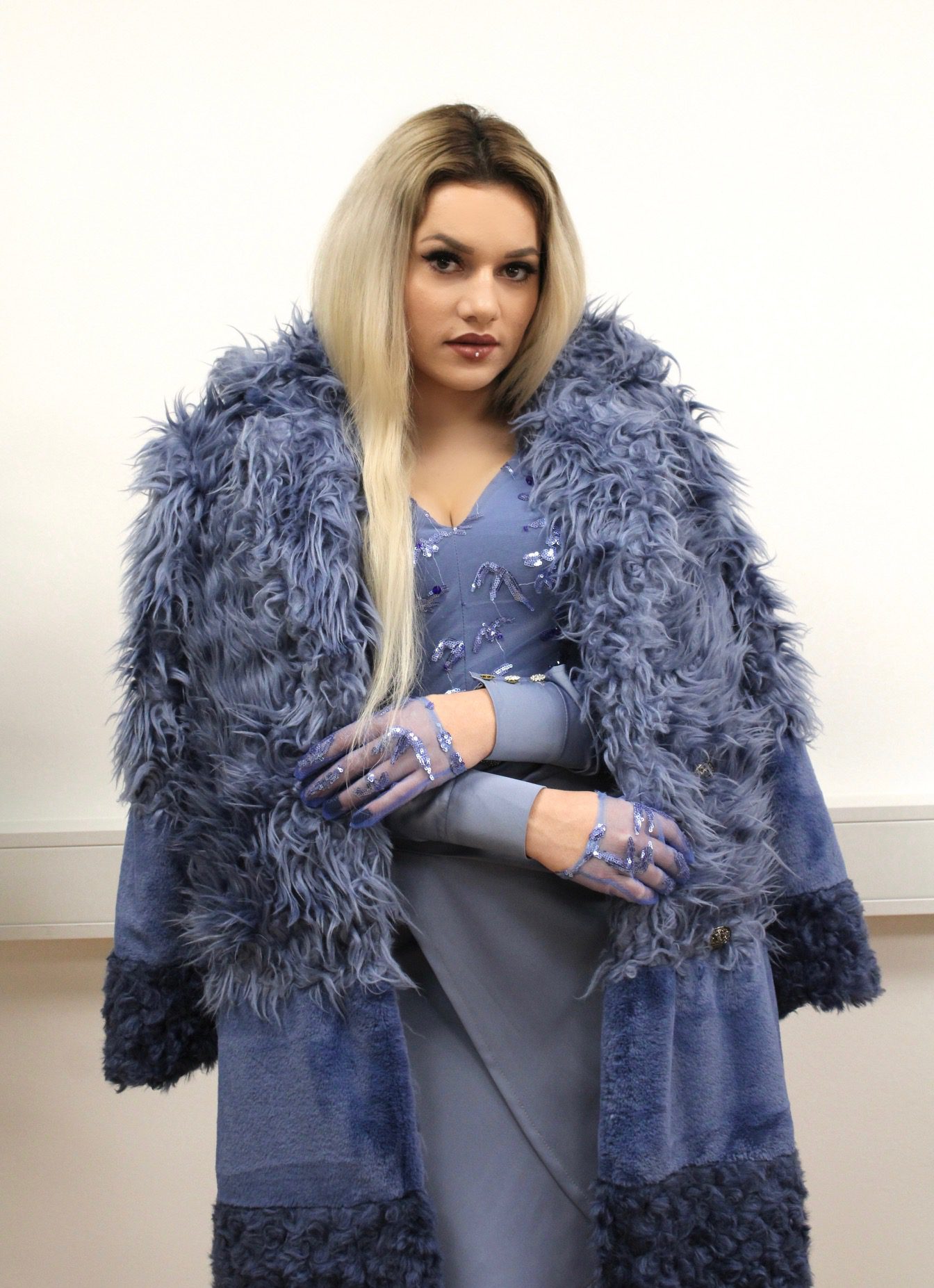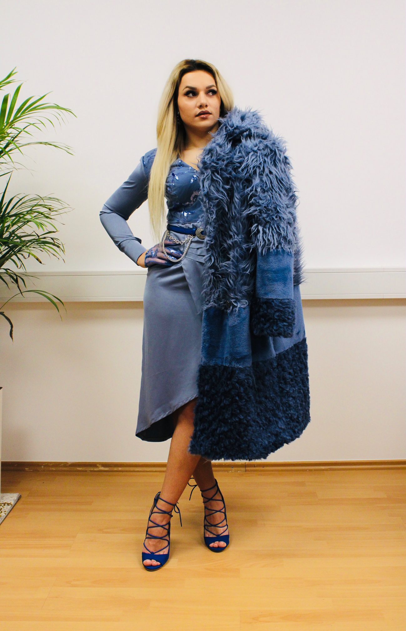 Modri plašč iz umetnega krzna