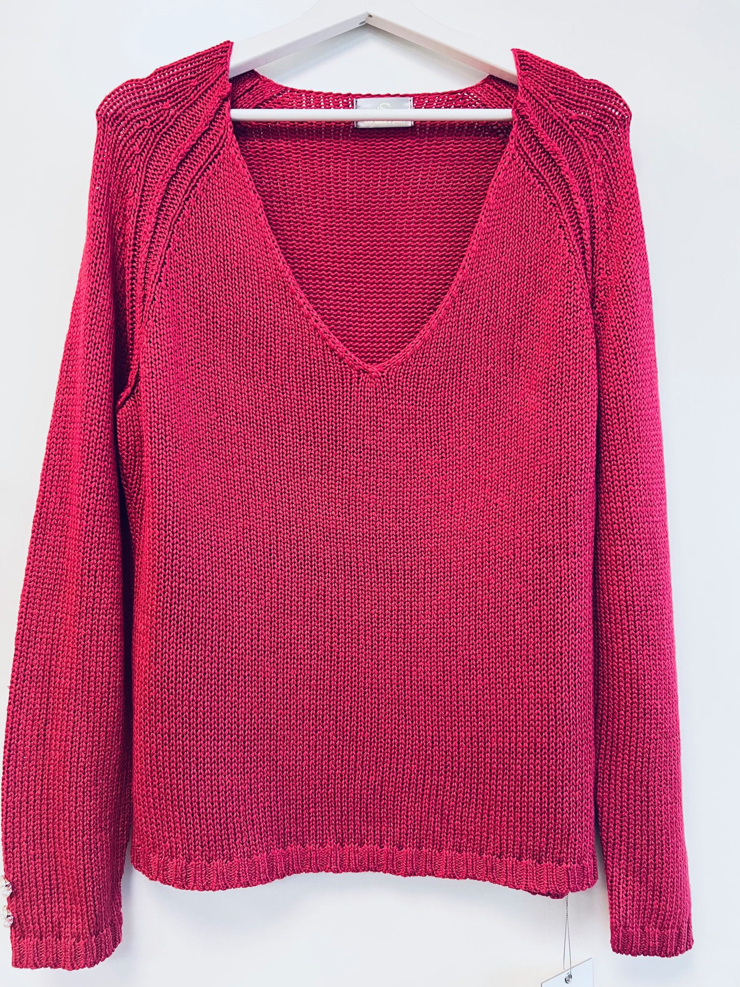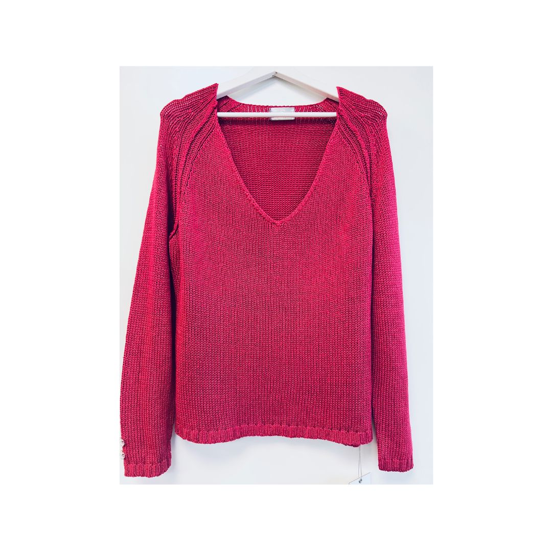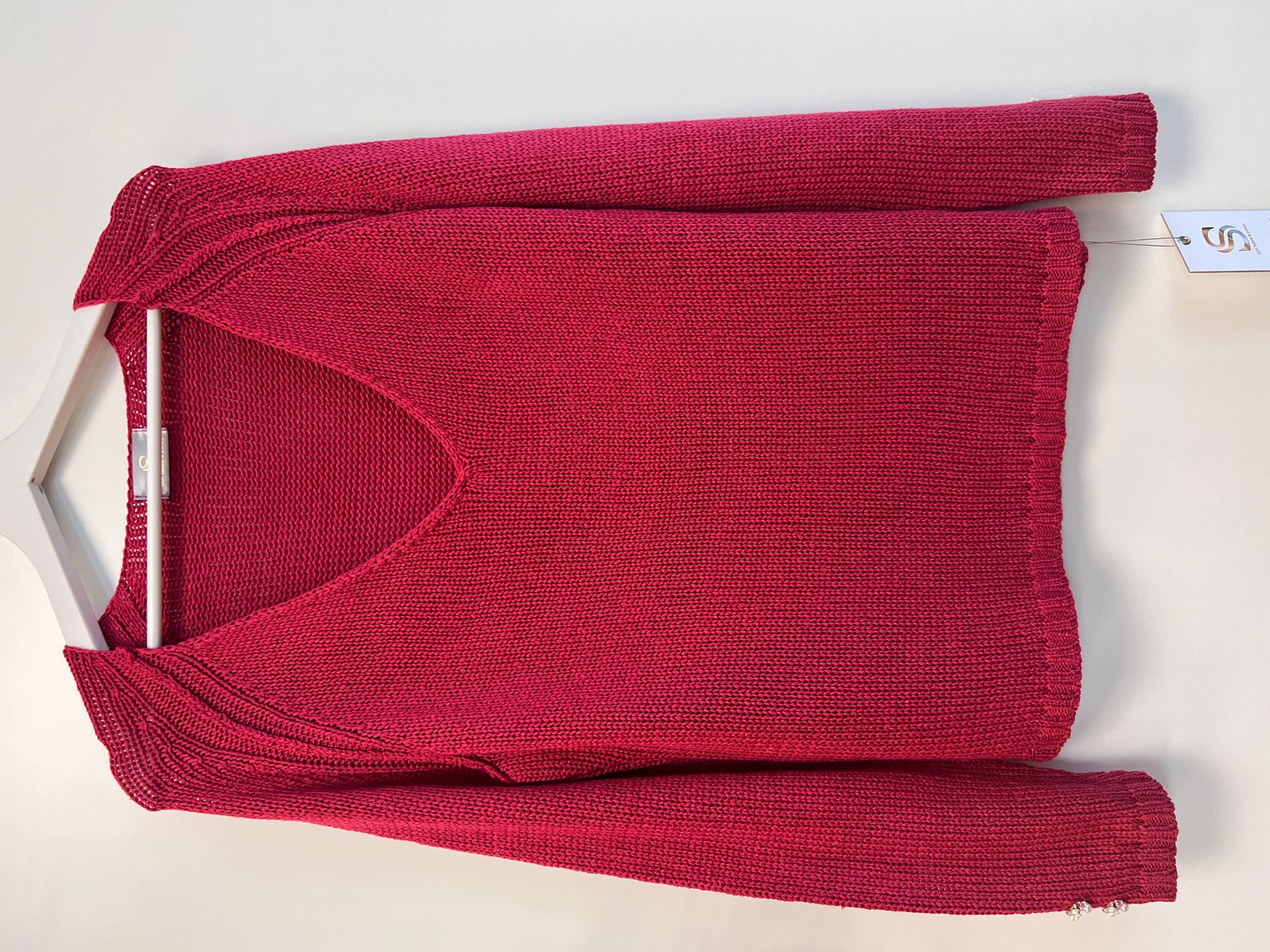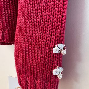 Pulover v umirjeni roza-rdeči barvi, okrašen z lepimi gumbi s kristalčki v roza in mlečno belih odtenkih.