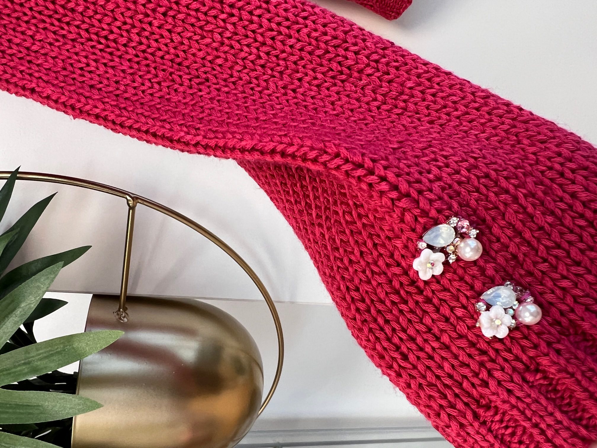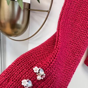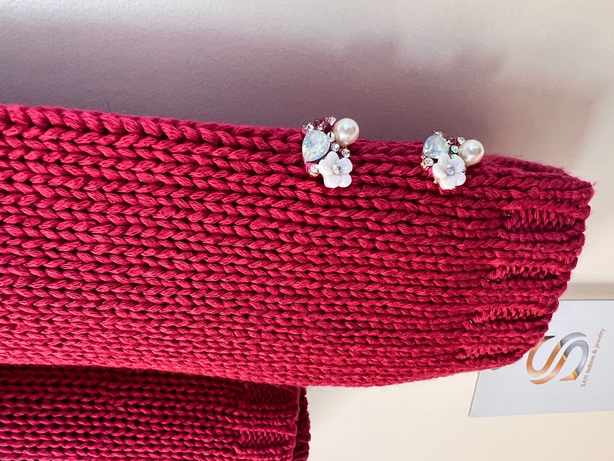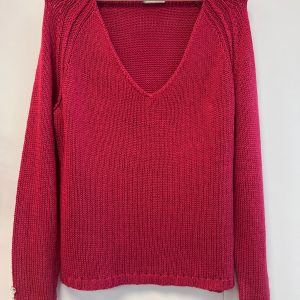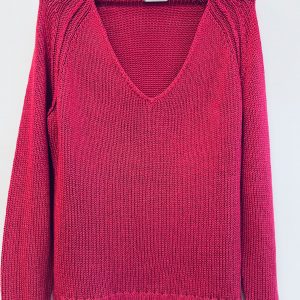 Pulover v umirjeni roza-rdeči barvi, okrašen z lepimi gumbi s kristalčki v roza in mlečno belih odtenkih.